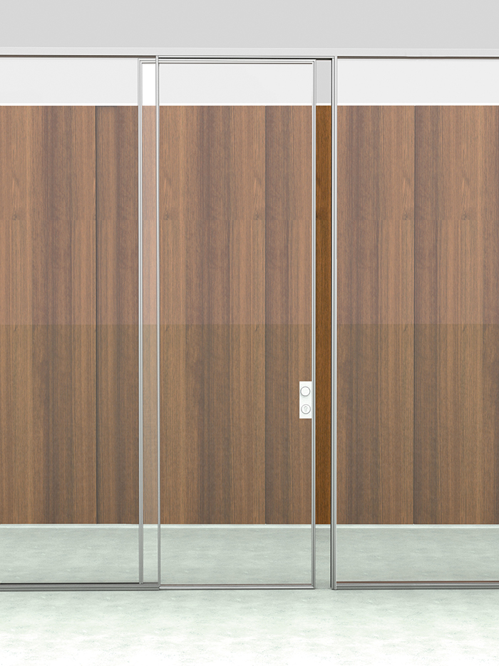 -Porta de um vidro temperado de 6 milímetros enquadrado em alumínio anodizado prata ou enverniçãdo epóxi, com espessura total de 40 mm.