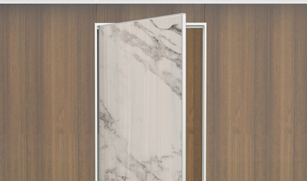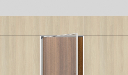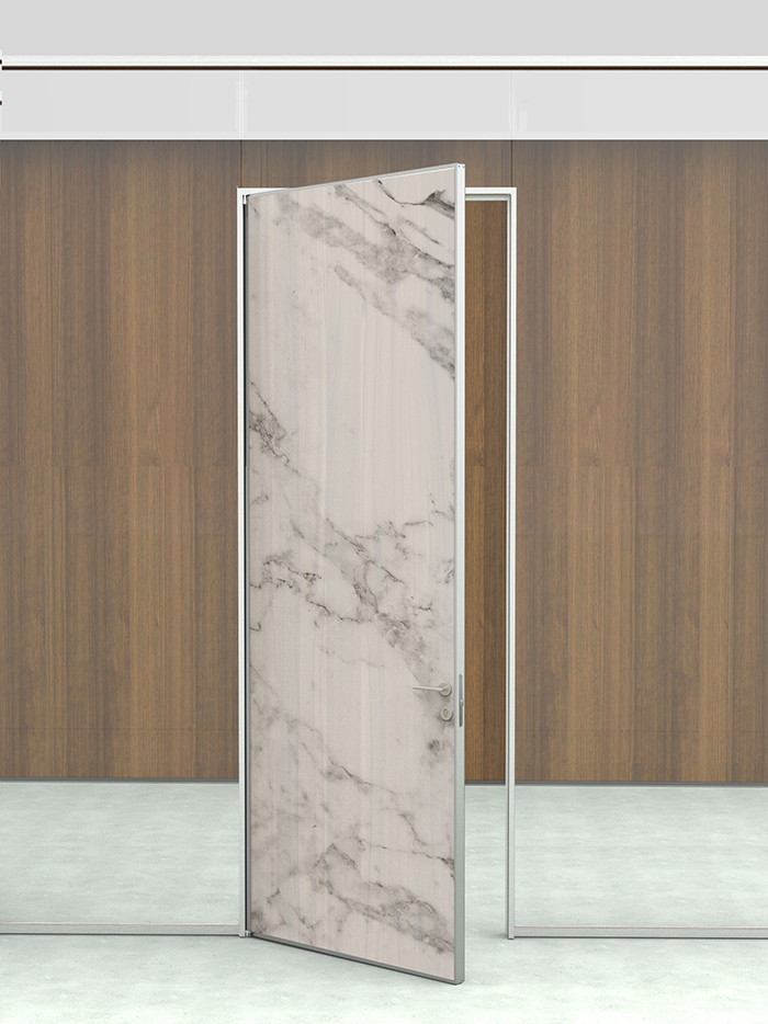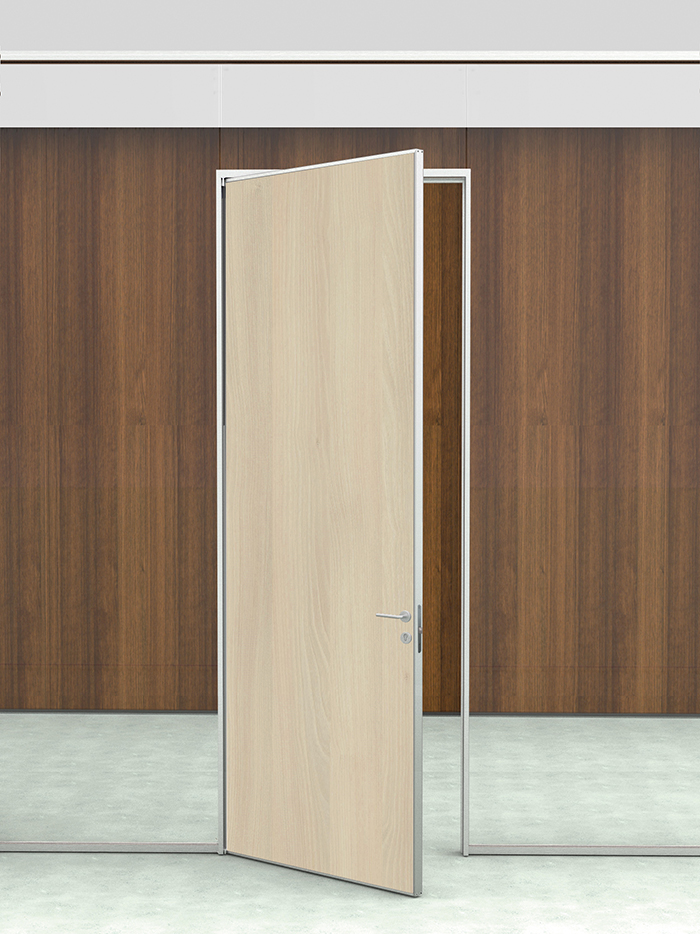 -Porta de uma folha cega de 40 milímetros de espessura em acabamento bilaminado, enverniçado ou madeira natural.