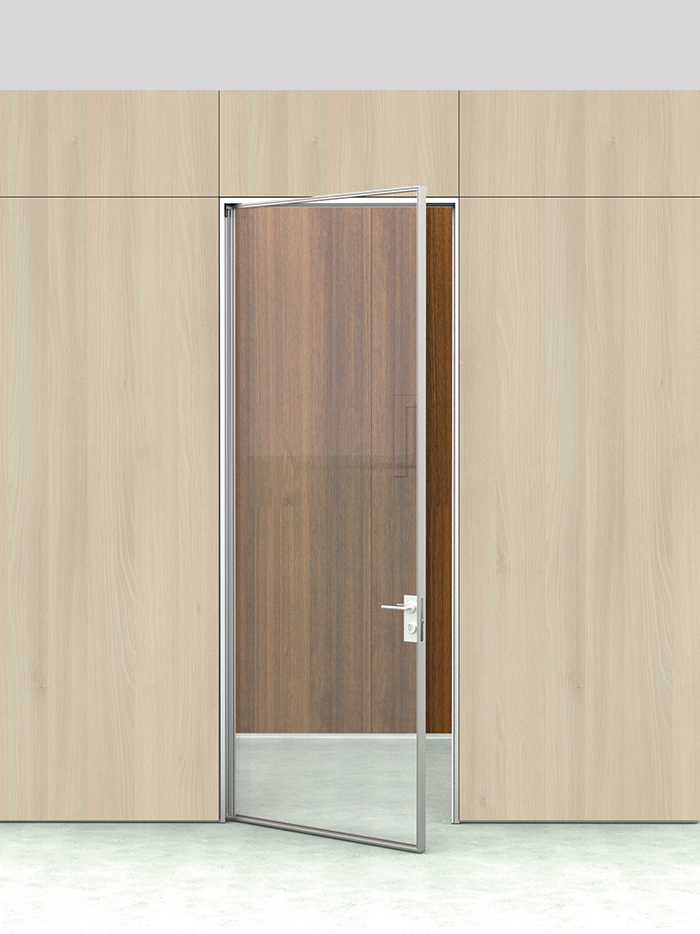 -Porta de um vidro temperado de 6 milímetros enquadrado em alumínio anodizado prata ou enverniçãdo epóxi, com espessura total de 40 mm.